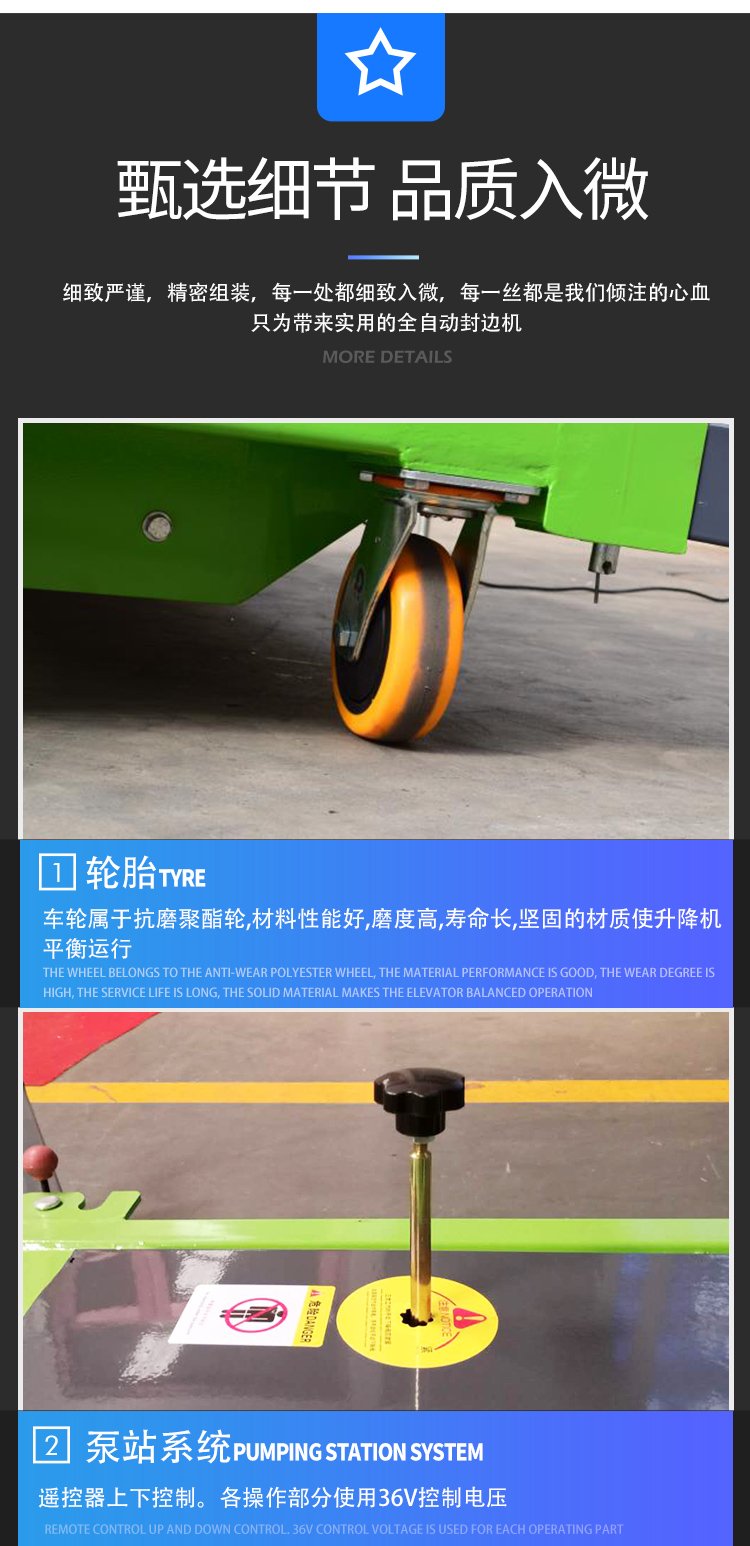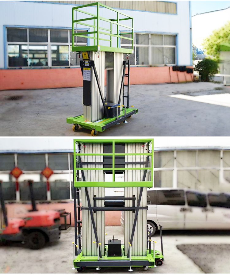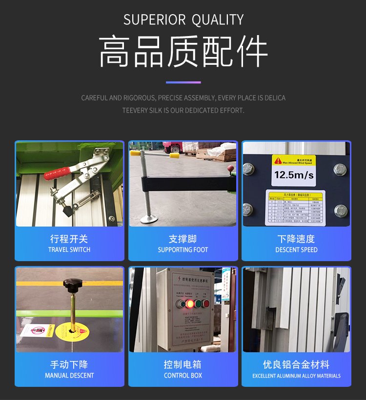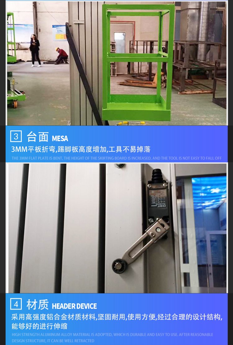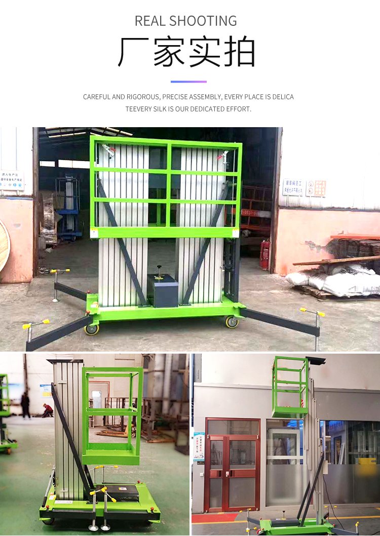 鋁合金液壓升降機(jī)主體采用高強(qiáng)度鋁合金材質(zhì)構(gòu)成,具有造型美觀、體積小、重量輕、升降平衡、安全可靠等優(yōu)點(diǎn),廣泛用于工廠、賓館、餐廳、車站、機(jī)場影劇院、展覽館等場所。該升降機(jī)承載能力強(qiáng),適合于兩人(可攜帶一定的重量工具和材料)同時(shí)登高作業(yè);還可根據(jù)不同環(huán)境訂制成各種非標(biāo)產(chǎn)品,以滿足不同需要;是保養(yǎng)機(jī)具、油漆裝修、調(diào)換燈具、電器、清潔保養(yǎng)等用途的安全伴侶。
