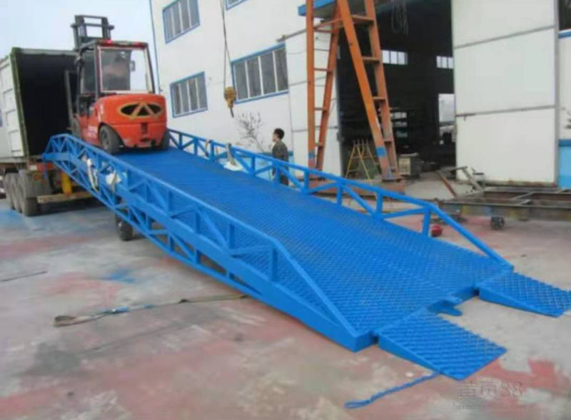 移動登車橋在現代物流現場已是一非常易見的結構形式,它是企業物流鏈的起點與終點,是企業快速、安全周轉產品及貨物的一個裝卸貨操作平臺。 裝卸貨操作平臺的高度固定,但來往運輸車廂的廂地高度不一,運輸車輛與裝卸貨站臺之間總是形成一定的高度落差或間隙。造成搬運叉車不能進出運輸車輛直接裝卸貨物。運用登車橋提供可靠的連接。使搬運叉車能夠安全、快速地進出運輸車輛進行裝卸貨作業。使用過程平穩可靠,安全性能高,裝卸貨物時節約了大量時間,省卻了大量人力,使裝卸貨物大大的提高了效率。臺面采用特制的菱形網格板有可靠的強度,能保證長期使用而不變形。它的菱形網狀結構,充分保證了防滑性能,使叉車有更好的爬坡性和可操縱性,即使在雨、雪天氣,仍能保證正常使用。