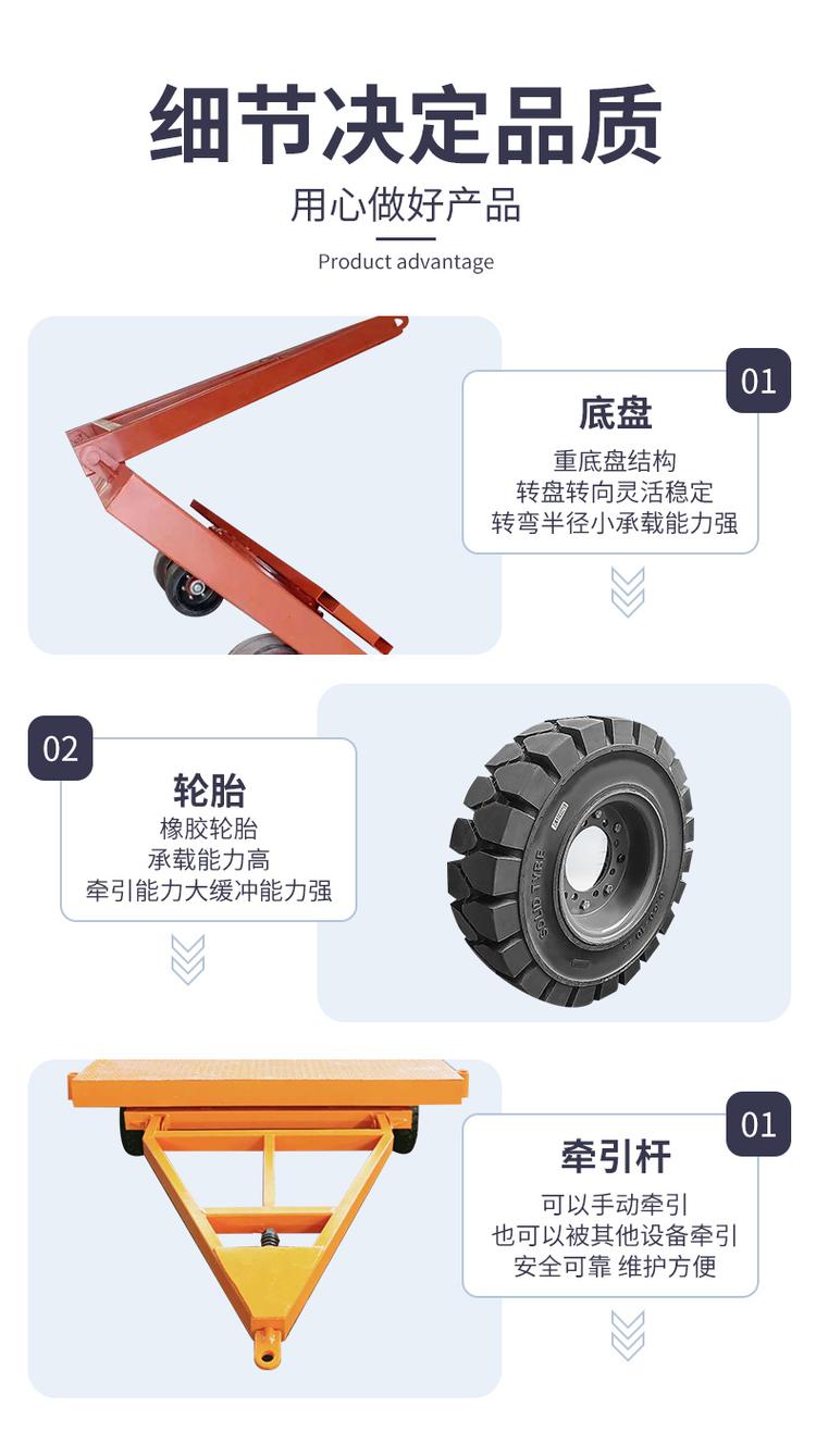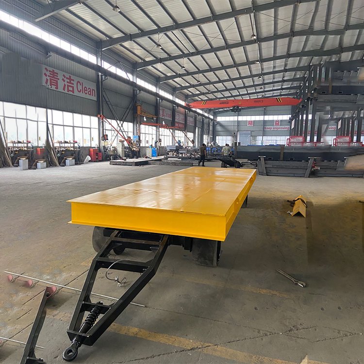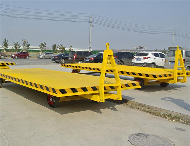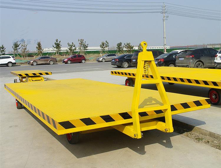 平板拖車本身無動力,可用叉車、牽引車牽引,適用于工廠、碼頭、港口、倉庫等場區內大宗貨物周轉運輸。
